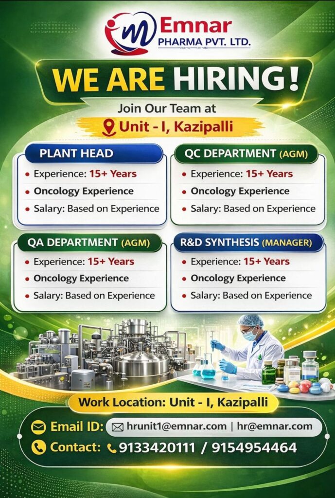 HomeHomePharma Job Openings at Emar: Plant Head, QC, QA & R&D Manager Roles in Oncology (Kazipalli) Pharma Job Openings at Emar: Plant Head, QC, QA & R&D Manager Roles in Oncology (Kazipalli) chandrakanth February 22, 2026 Post Views: 18 Related posts: SSterling Hospitals Hiring 2025 | Medical Officer, Staff Nurse & Assistant Manager Jobs AP కాంట్రాక్ట్ / అవుట్సోర్సింగ్ ఉద్యోగాలు 2025 | RMC Jobs Recruitment 2025 | అర్హత & దరఖాస్తు వివరాలు Sai Life Sciences Walk-In Interview 2026 | Analytical R&D (API) Jobs – Hyderabad Work From Home HR Jobs | Freshers Eligible | ₹30K-58K Salary + Incentives | Monday-Friday Share Pinterest Tweet Email Linkedin Whatsapp Telegram Prev Article Next Article Leave a Reply Cancel Reply Save my name, email, and website in this browser for the next time I comment.