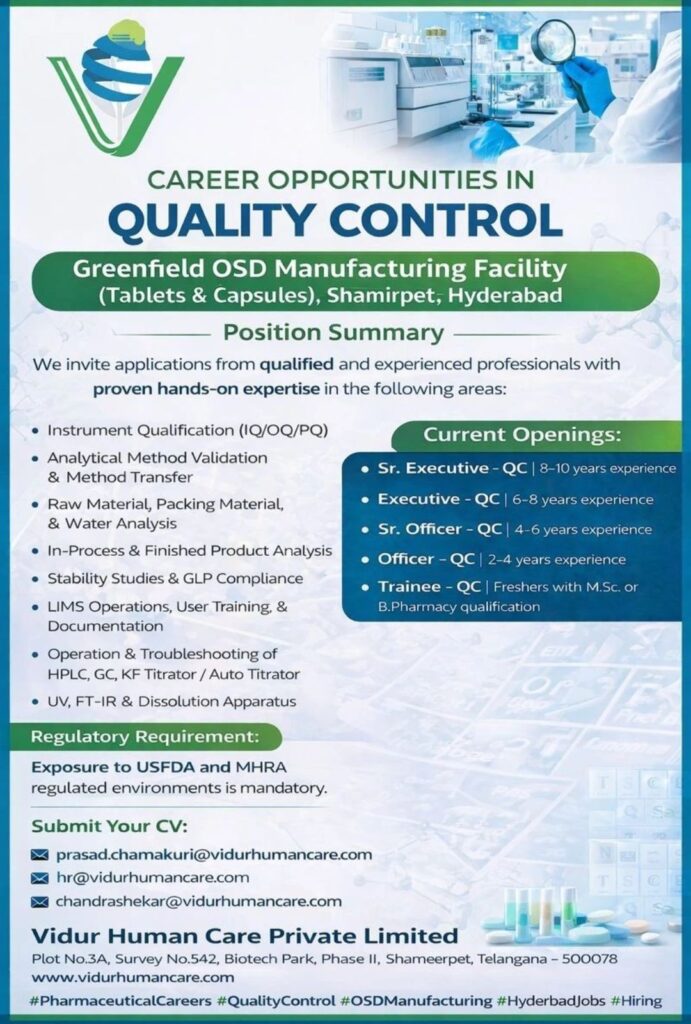HomePharma JobsQC Jobs in Hyderabad for Pharmaceutical Professionals Hiring QC Officers & Executives | OSD Plant, Shamirpet, Hyderabad QC Jobs in Hyderabad for Pharmaceutical Professionals Hiring QC Officers & Executives | OSD Plant, Shamirpet, Hyderabad chandrakanth February 1, 2026 Post Views: 23 Related posts: Unilever Jobs for Freshers | Associate Global Market Vigilance (Pharmacovigilance) Sun Pharmaceutical Industries Hiring 2026 | Executive – Analytical Development R&D Jobs – Baroda “Intas Pharmaceuticals Walk In Drive 2025 | Jobs in Multiple Departments” “Lubrizol Careers 2025 | Hiring Production Executive – Navi Mumbai Maharashtra” Share Pinterest Tweet Email Linkedin Whatsapp Telegram Prev Article Next Article Leave a Reply Cancel Reply Save my name, email, and website in this browser for the next time I comment.