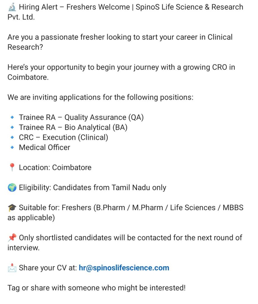 SpinoS Life Science Hiring Freshers in Coimbatore | Clinical Research Jobs for B.Pharm, M.Pharm & Life Sciences