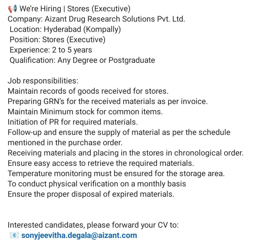 Stores Executive Job in Hyderabad – Aizant Drug Research Solutions