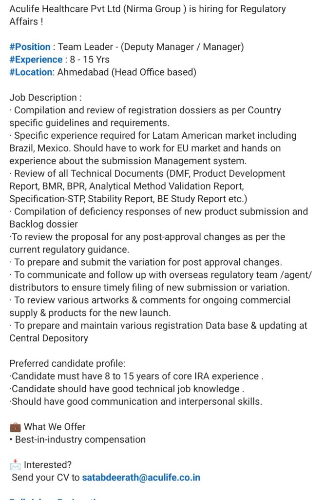 Team Leader Regulatory Affairs Opening at Aculife Healthcare – Apply Now for Ahmedabad Location
