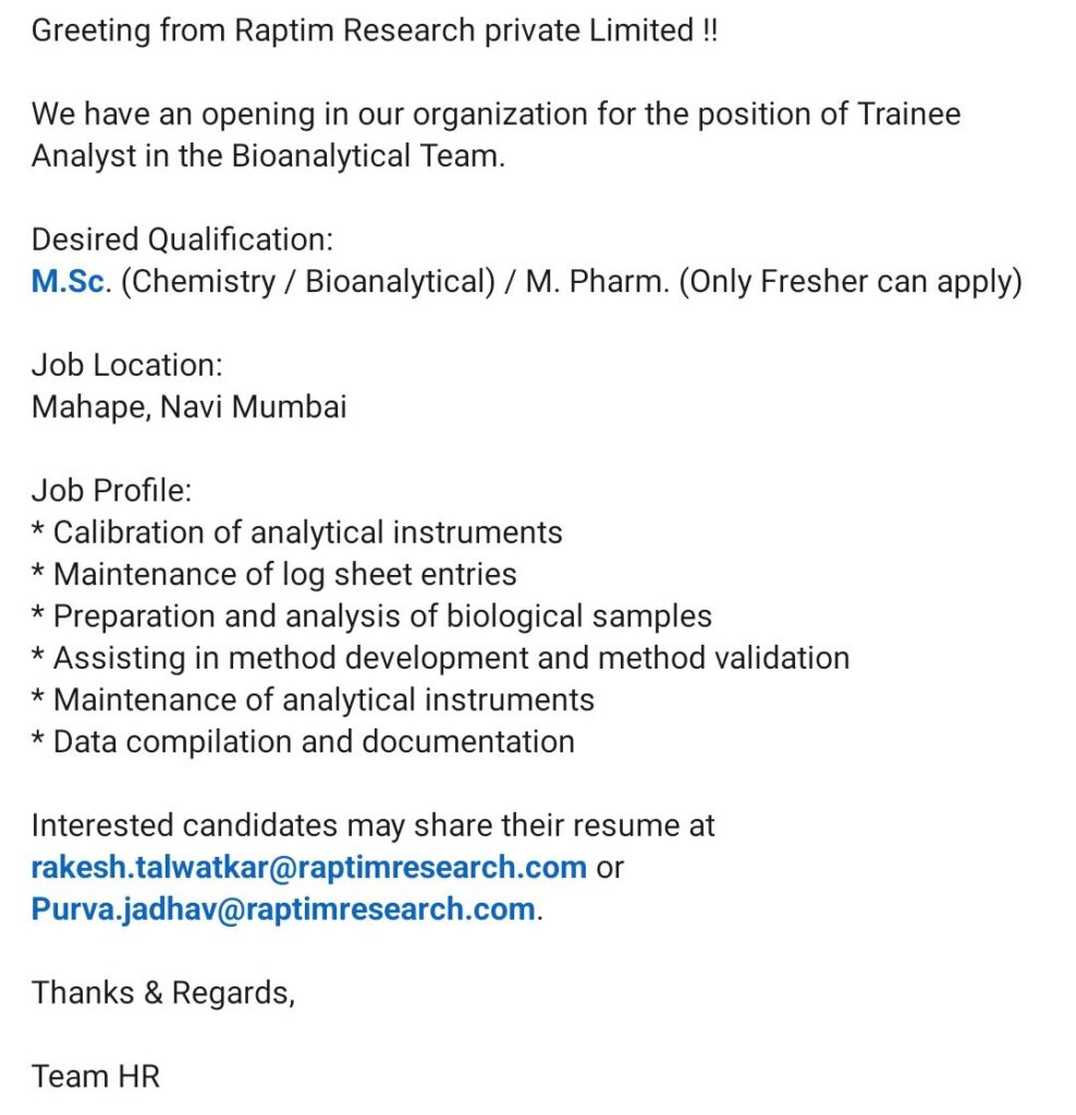 HomeHomeTrainee Analyst Job Opening at Raptim Research – M.Sc. Chemistry / M.Pharm Fresher | Mahape, Navi Mumbai Trainee Analyst Job Opening at Raptim Research – M.Sc. Chemistry / M.Pharm Fresher | Mahape, Navi Mumbai chandrakanth February 12, 2026 Post Views: 29 Related posts: SSterling Hospitals Hiring 2025 | Medical Officer, Staff Nurse & Assistant Manager Jobs AP కాంట్రాక్ట్ / అవుట్సోర్సింగ్ ఉద్యోగాలు 2025 | RMC Jobs Recruitment 2025 | అర్హత & దరఖాస్తు వివరాలు Clinical Research Coordinator (CRC) Job in Pune – Agenome Research Hiring DMPK Certificate Program: Drug Metabolism & Pharmacokinetics Course by Syngene & JSS AHER Share Pinterest Tweet Email Linkedin Whatsapp Telegram Prev Article Next Article Leave a Reply Cancel Reply Save my name, email, and website in this browser for the next time I comment.