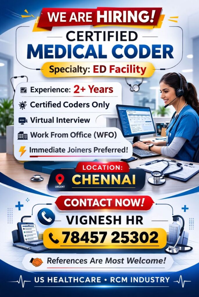 HomeHomeUrgent Opening for Certified Medical Coder (ED Facility) – Chennai | WFO Urgent Opening for Certified Medical Coder (ED Facility) – Chennai | WFO chandrakanth February 18, 2026 Post Views: 4 Related posts: SSterling Hospitals Hiring 2025 | Medical Officer, Staff Nurse & Assistant Manager Jobs AP కాంట్రాక్ట్ / అవుట్సోర్సింగ్ ఉద్యోగాలు 2025 | RMC Jobs Recruitment 2025 | అర్హత & దరఖాస్తు వివరాలు Sai Life Sciences Walk-In Interview 2026 | Analytical R&D (API) Jobs – Hyderabad Work From Home HR Jobs | Freshers Eligible | ₹30K-58K Salary + Incentives | Monday-Friday Share Pinterest Tweet Email Linkedin Whatsapp Telegram Prev Article Next Article Leave a Reply Cancel Reply Save my name, email, and website in this browser for the next time I comment.