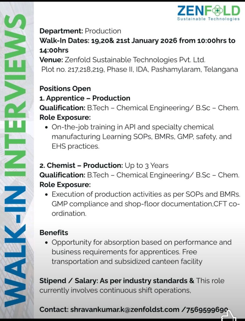 • Walk-In for B.Tech Chemical / B.Sc Chemistry – Production Roles | Pashamylaram, Telangana