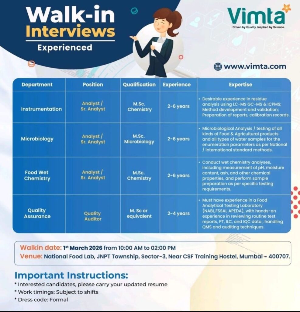 HomeHomeWalk-in Interview for Analyst & QA Roles | National Food Lab, Mumbai | M.Sc (Chemistry/Microbiology) | 1st March 2026 Walk-in Interview for Analyst & QA Roles | National Food Lab, Mumbai | M.Sc (Chemistry/Microbiology) | 1st March 2026 chandrakanth February 22, 2026 Post Views: 25 Related posts: SSterling Hospitals Hiring 2025 | Medical Officer, Staff Nurse & Assistant Manager Jobs AP కాంట్రాక్ట్ / అవుట్సోర్సింగ్ ఉద్యోగాలు 2025 | RMC Jobs Recruitment 2025 | అర్హత & దరఖాస్తు వివరాలు Sai Life Sciences Walk-In Interview 2026 | Analytical R&D (API) Jobs – Hyderabad Work From Home HR Jobs | Freshers Eligible | ₹30K-58K Salary + Incentives | Monday-Friday Share Pinterest Tweet Email Linkedin Whatsapp Telegram Prev Article Next Article Leave a Reply Cancel Reply Save my name, email, and website in this browser for the next time I comment.