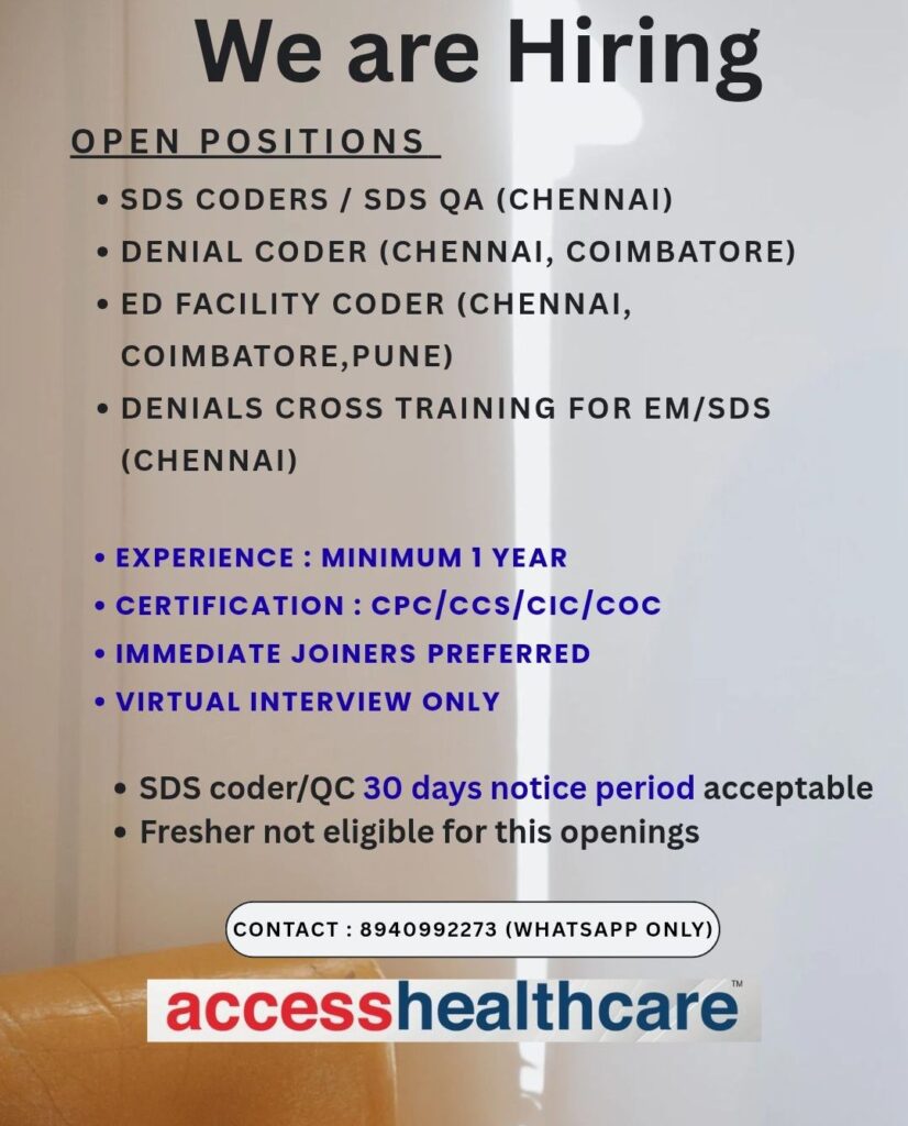 HomeHomeAccess Healthcare Hiring Medical Coders | SDS, Denials & ED Facility | CPC Certified | Chennai, Coimbatore, Pune Access Healthcare Hiring Medical Coders | SDS, Denials & ED Facility | CPC Certified | Chennai, Coimbatore, Pune chandrakanth March 16, 2026 Post Views: 2 Related posts: SSterling Hospitals Hiring 2025 | Medical Officer, Staff Nurse & Assistant Manager Jobs AP కాంట్రాక్ట్ / అవుట్సోర్సింగ్ ఉద్యోగాలు 2025 | RMC Jobs Recruitment 2025 | అర్హత & దరఖాస్తు వివరాలు Sai Life Sciences Walk-In Interview 2026 | Analytical R&D (API) Jobs – Hyderabad Hiring HCC Coder 2026: Freshers & Experienced | Work from Home / Office | Apply Now Share Pinterest Tweet Email Linkedin Whatsapp Telegram Prev Article Next Article Leave a Reply Cancel Reply Save my name, email, and website in this browser for the next time I comment.