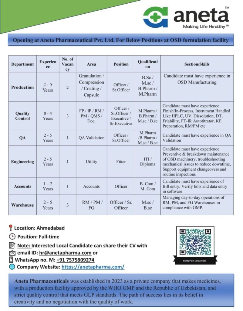 Aneta Pharmaceutical Hiring in Ahmedabad | Production, QC, QA, Engineering, Accounts & Warehouse Jobs