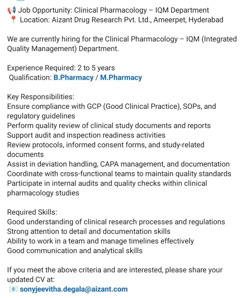 HomeHomeClinical Pharmacology Job in Hyderabad | IQM Department | Aizant Drug Research | 2-5 Years Clinical Pharmacology Job in Hyderabad | IQM Department | Aizant Drug Research | 2-5 Years chandrakanth March 17, 2026 Post Views: 2 Related posts: SSterling Hospitals Hiring 2025 | Medical Officer, Staff Nurse & Assistant Manager Jobs AP కాంట్రాక్ట్ / అవుట్సోర్సింగ్ ఉద్యోగాలు 2025 | RMC Jobs Recruitment 2025 | అర్హత & దరఖాస్తు వివరాలు Sai Life Sciences Walk-In Interview 2026 | Analytical R&D (API) Jobs – Hyderabad Hiring HCC Coder 2026: Freshers & Experienced | Work from Home / Office | Apply Now Share Pinterest Tweet Email Linkedin Whatsapp Telegram Prev Article Next Article Leave a Reply Cancel Reply Save my name, email, and website in this browser for the next time I comment.