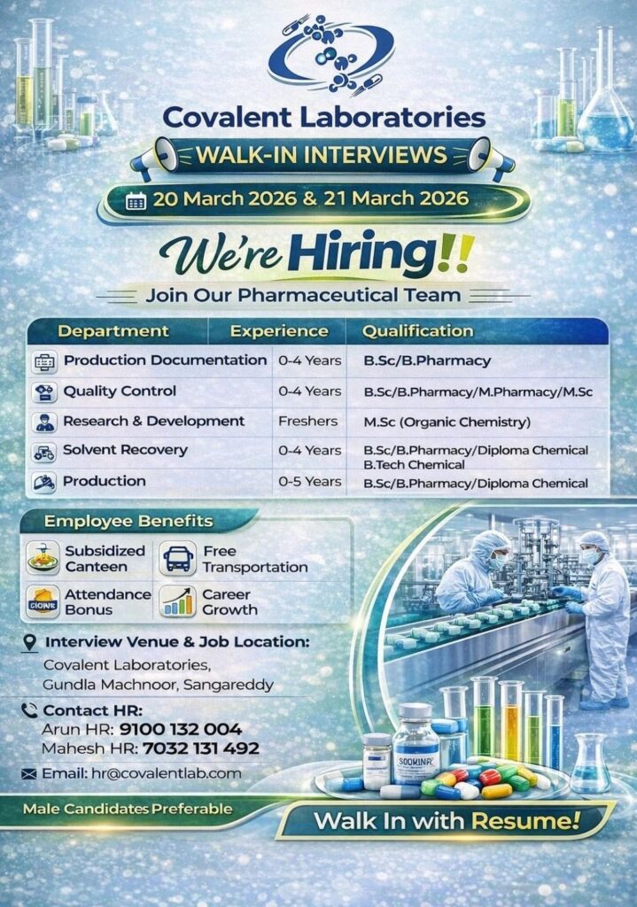 • Covalent Laboratories Walk-in Interview 2026 | Production, QC & R&D Jobs for Freshers & Experienced | Sangareddy