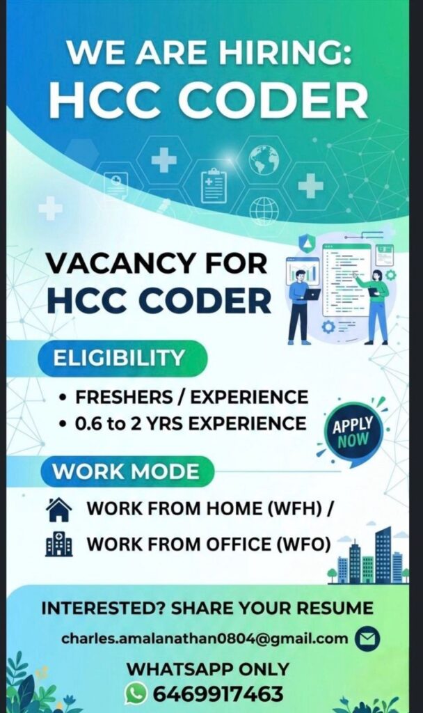 HomeHomeHCC Coder Job Openings 2026 | Work From Home / Office | Freshers & Experienced (0.6–2 Years) | Apply Now HCC Coder Job Openings 2026 | Work From Home / Office | Freshers & Experienced (0.6–2 Years) | Apply Now chandrakanth March 15, 2026 Post Views: 2 Related posts: SSterling Hospitals Hiring 2025 | Medical Officer, Staff Nurse & Assistant Manager Jobs AP కాంట్రాక్ట్ / అవుట్సోర్సింగ్ ఉద్యోగాలు 2025 | RMC Jobs Recruitment 2025 | అర్హత & దరఖాస్తు వివరాలు Sai Life Sciences Walk-In Interview 2026 | Analytical R&D (API) Jobs – Hyderabad Intern Clinical Research Coordinator Jobs in PCMC, Pune – Freshers Hiring Share Pinterest Tweet Email Linkedin Whatsapp Telegram Prev Article Next Article Leave a Reply Cancel Reply Save my name, email, and website in this browser for the next time I comment.