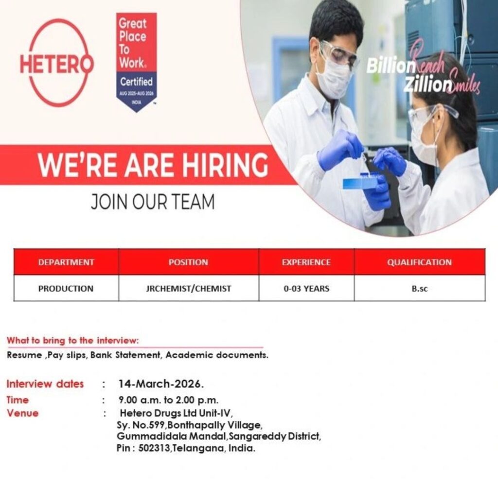 • Hetero Drugs Recruitment 2026 | Jr Chemist Jobs | Production Openings | B.Sc Chemistry | Telangana Walk-in Drive