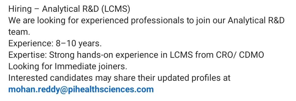 HomeHomeHiring: Analytical R&D Manager/Scientist – LCMS Expert (8-10 Years, CRO/CDMO) | Pi Health Sciences Hiring: Analytical R&D Manager/Scientist – LCMS Expert (8-10 Years, CRO/CDMO) | Pi Health Sciences chandrakanth March 1, 2026 Post Views: 3 Related posts: SSterling Hospitals Hiring 2025 | Medical Officer, Staff Nurse & Assistant Manager Jobs AP కాంట్రాక్ట్ / అవుట్సోర్సింగ్ ఉద్యోగాలు 2025 | RMC Jobs Recruitment 2025 | అర్హత & దరఖాస్తు వివరాలు Sai Life Sciences Walk-In Interview 2026 | Analytical R&D (API) Jobs – Hyderabad HCC Coder WFH Opportunity | Urgent Hiring | Salary up to ₹50,000 Share Pinterest Tweet Email Linkedin Whatsapp Telegram Prev Article Leave a Reply Cancel Reply Save my name, email, and website in this browser for the next time I comment.