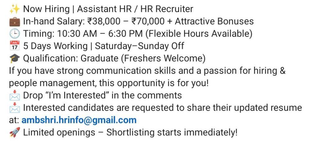 HomeHomeHiring Assistant HR / HR Recruiter | In-Hand Salary ₹38K–₹70K + Bonuses | Freshers Welcome | 5 Days Working Hiring Assistant HR / HR Recruiter | In-Hand Salary ₹38K–₹70K + Bonuses | Freshers Welcome | 5 Days Working chandrakanth March 16, 2026 Post Views: 8 Related posts: SSterling Hospitals Hiring 2025 | Medical Officer, Staff Nurse & Assistant Manager Jobs AP కాంట్రాక్ట్ / అవుట్సోర్సింగ్ ఉద్యోగాలు 2025 | RMC Jobs Recruitment 2025 | అర్హత & దరఖాస్తు వివరాలు Sai Life Sciences Walk-In Interview 2026 | Analytical R&D (API) Jobs – Hyderabad Hiring HCC Coder 2026: Freshers & Experienced | Work from Home / Office | Apply Now Share Pinterest Tweet Email Linkedin Whatsapp Telegram Prev Article Next Article Leave a Reply Cancel Reply Save my name, email, and website in this browser for the next time I comment.