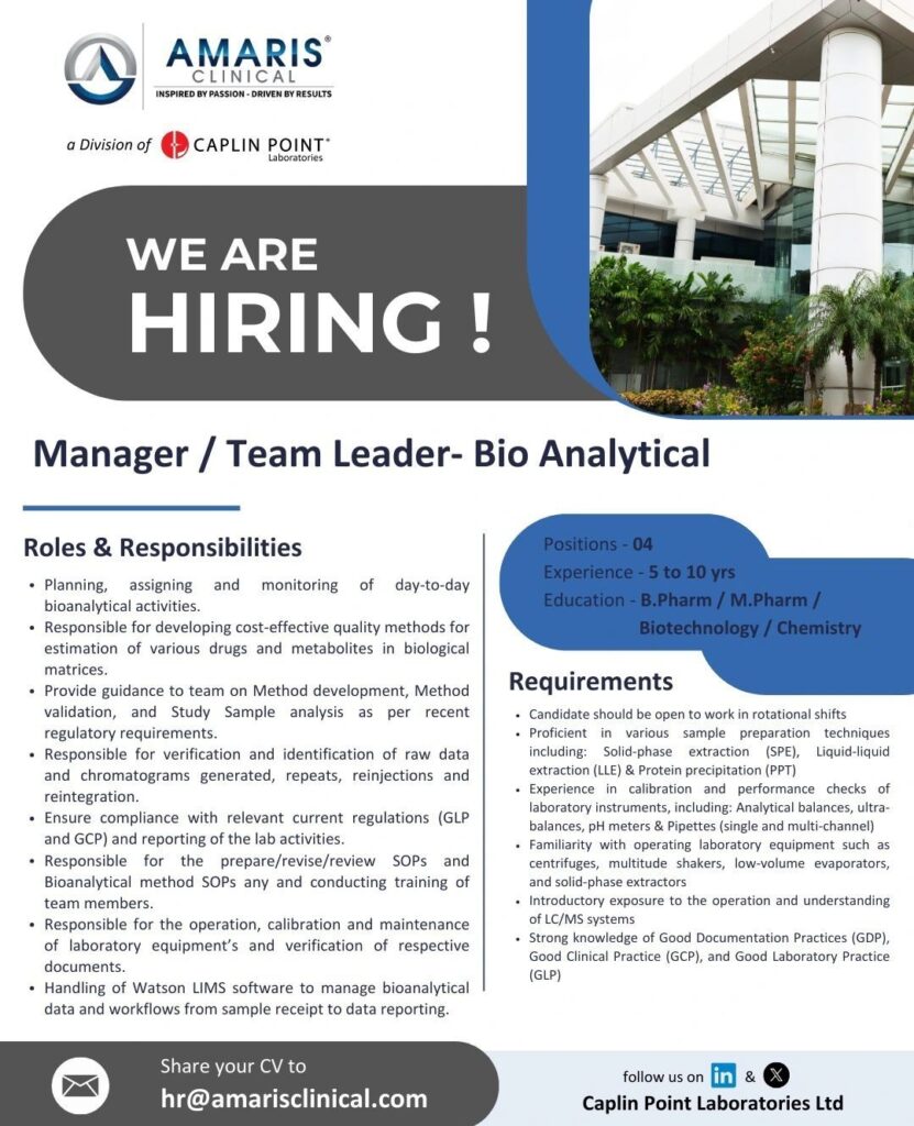Hiring Bioanalytical Manager & Team Leader | Method Development, GLP, LC-MS/MS | 5-10 Years Experience (4 Openings)
