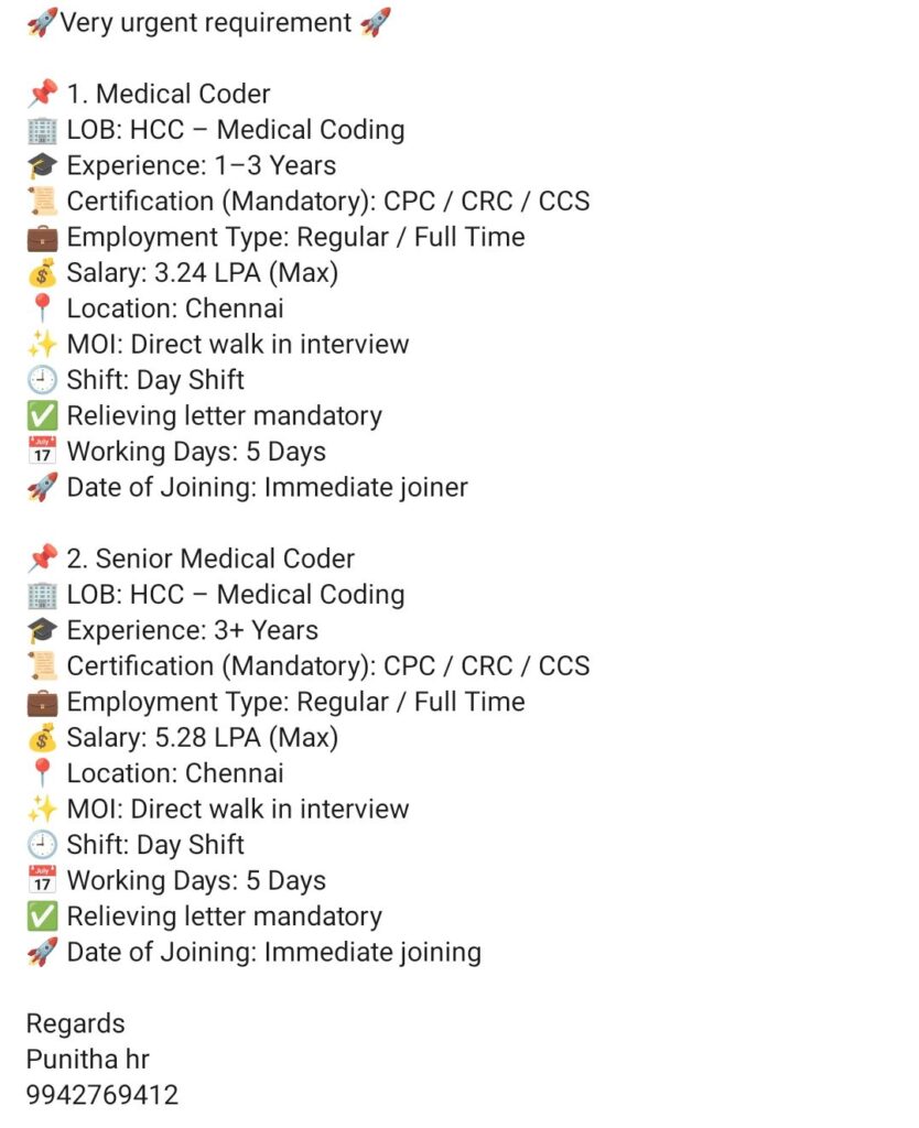 Hiring HCC Medical Coder & Senior Medical Coder | CPC/CRC/CCS Certified | Chennai Walk-in Drive | Immediate Joiner