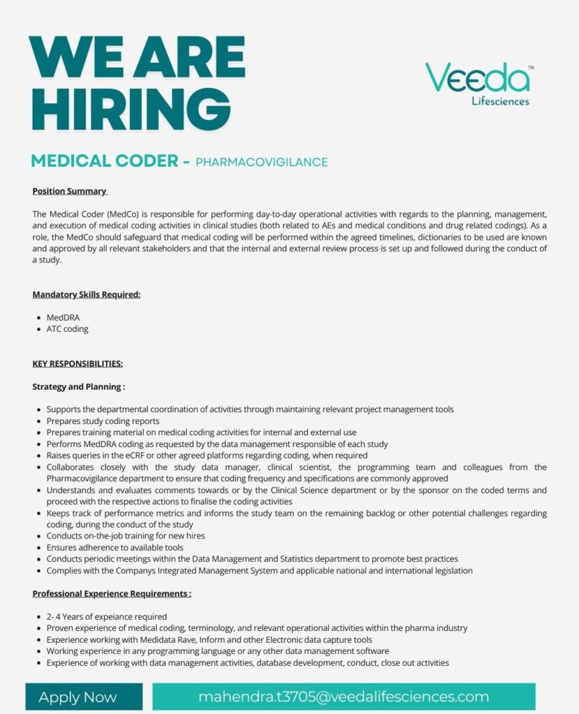HomeHomeHiring Medical Coder – Pharmacovigilance | MedDRA & ATC Coding | 2-4 Years Exp | Pharma Industry Hiring Medical Coder – Pharmacovigilance | MedDRA & ATC Coding | 2-4 Years Exp | Pharma Industry chandrakanth March 12, 2026 Post Views: 9 Related posts: SSterling Hospitals Hiring 2025 | Medical Officer, Staff Nurse & Assistant Manager Jobs AP కాంట్రాక్ట్ / అవుట్సోర్సింగ్ ఉద్యోగాలు 2025 | RMC Jobs Recruitment 2025 | అర్హత & దరఖాస్తు వివరాలు Sai Life Sciences Walk-In Interview 2026 | Analytical R&D (API) Jobs – Hyderabad Intern Clinical Research Coordinator Jobs in PCMC, Pune – Freshers Hiring Share Pinterest Tweet Email Linkedin Whatsapp Telegram Prev Article Next Article Leave a Reply Cancel Reply Save my name, email, and website in this browser for the next time I comment.