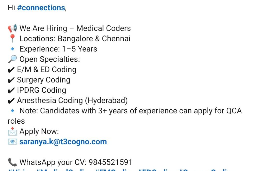 HomeHomeHiring Medical Coders – Bangalore, Chennai, Hyderabad | E/M, ED, Surgery, IPDRG, Anesthesia Hiring Medical Coders – Bangalore, Chennai, Hyderabad | E/M, ED, Surgery, IPDRG, Anesthesia chandrakanth March 31, 2026 Post Views: 2 Related posts: SSterling Hospitals Hiring 2025 | Medical Officer, Staff Nurse & Assistant Manager Jobs AP కాంట్రాక్ట్ / అవుట్సోర్సింగ్ ఉద్యోగాలు 2025 | RMC Jobs Recruitment 2025 | అర్హత & దరఖాస్తు వివరాలు Sai Life Sciences Walk-In Interview 2026 | Analytical R&D (API) Jobs – Hyderabad Fresher Walk-in Interviews in Daman: B.Pharm, M.Sc, ITI, Diploma | USV Pharma Jobs – 18 Jan 2026 Share Pinterest Tweet Email Linkedin Whatsapp Telegram Prev Article Next Article Leave a Reply Cancel Reply Save my name, email, and website in this browser for the next time I comment.