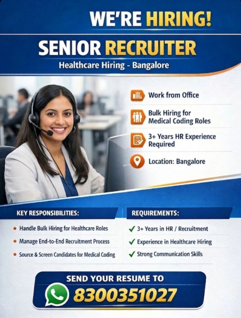 HomeHomeHiring Senior Recruiter – Healthcare (Medical Coding) | Bangalore | Work from Office | 3+ Years Experience Hiring Senior Recruiter – Healthcare (Medical Coding) | Bangalore | Work from Office | 3+ Years Experience chandrakanth March 12, 2026 Post Views: 4 Related posts: SSterling Hospitals Hiring 2025 | Medical Officer, Staff Nurse & Assistant Manager Jobs AP కాంట్రాక్ట్ / అవుట్సోర్సింగ్ ఉద్యోగాలు 2025 | RMC Jobs Recruitment 2025 | అర్హత & దరఖాస్తు వివరాలు Sai Life Sciences Walk-In Interview 2026 | Analytical R&D (API) Jobs – Hyderabad Intern Clinical Research Coordinator Jobs in PCMC, Pune – Freshers Hiring Share Pinterest Tweet Email Linkedin Whatsapp Telegram Prev Article Next Article Leave a Reply Cancel Reply Save my name, email, and website in this browser for the next time I comment.