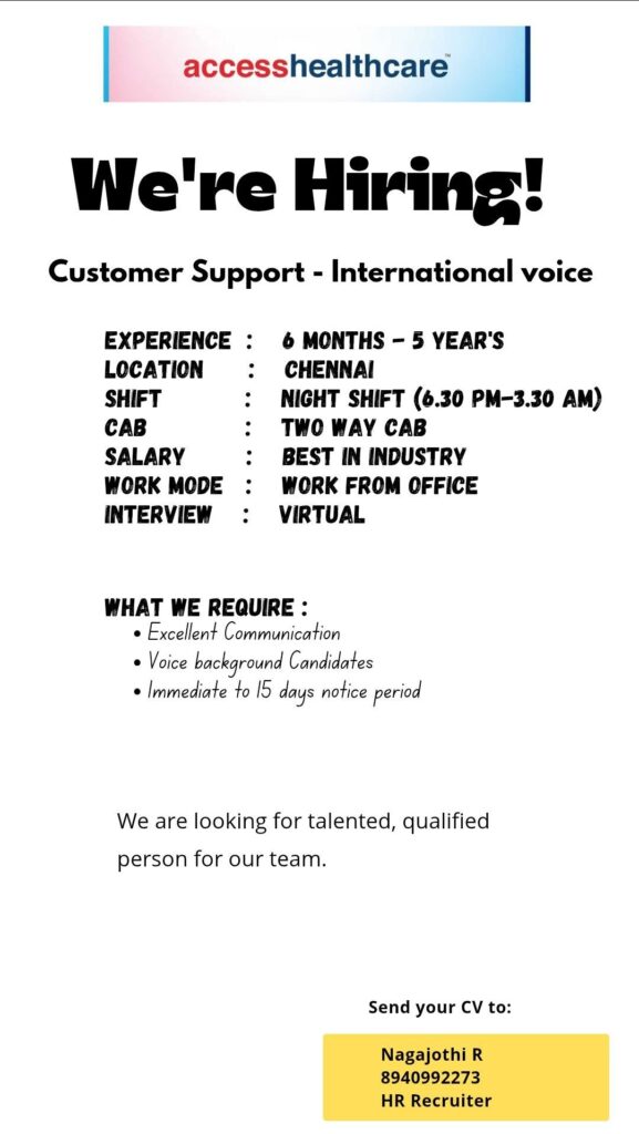 HomeHomeInternational Voice Process Customer Support Hiring in Chennai | Night Shift with Cab | Work from Office International Voice Process Customer Support Hiring in Chennai | Night Shift with Cab | Work from Office chandrakanth March 16, 2026 Post Views: 3 Related posts: SSterling Hospitals Hiring 2025 | Medical Officer, Staff Nurse & Assistant Manager Jobs AP కాంట్రాక్ట్ / అవుట్సోర్సింగ్ ఉద్యోగాలు 2025 | RMC Jobs Recruitment 2025 | అర్హత & దరఖాస్తు వివరాలు Sai Life Sciences Walk-In Interview 2026 | Analytical R&D (API) Jobs – Hyderabad Hiring HCC Coder 2026: Freshers & Experienced | Work from Home / Office | Apply Now Share Pinterest Tweet Email Linkedin Whatsapp Telegram Prev Article Next Article Leave a Reply Cancel Reply Save my name, email, and website in this browser for the next time I comment.