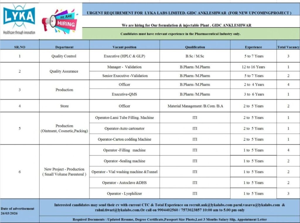 Lyka Labs Urgent Hiring 2026 | Formulation & Injectable Plant | Ankleshwar GIDC | Quality Control, Assurance, Production, Store & Operator Vacancies
