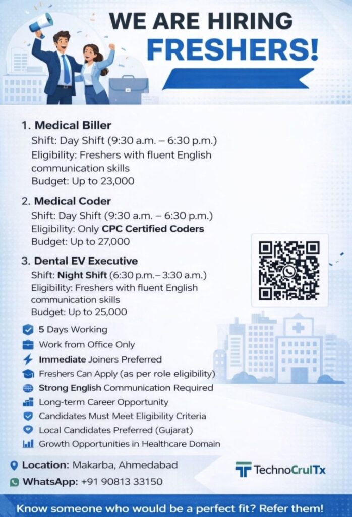HomeHomeMedical Biller, Coder & Dental EV Executive Jobs for Freshers in Makarba, Ahmedabad Medical Biller, Coder & Dental EV Executive Jobs for Freshers in Makarba, Ahmedabad chandrakanth March 17, 2026 Post Views: 4 Related posts: SSterling Hospitals Hiring 2025 | Medical Officer, Staff Nurse & Assistant Manager Jobs AP కాంట్రాక్ట్ / అవుట్సోర్సింగ్ ఉద్యోగాలు 2025 | RMC Jobs Recruitment 2025 | అర్హత & దరఖాస్తు వివరాలు Sai Life Sciences Walk-In Interview 2026 | Analytical R&D (API) Jobs – Hyderabad Hiring HCC Coder 2026: Freshers & Experienced | Work from Home / Office | Apply Now Share Pinterest Tweet Email Linkedin Whatsapp Telegram Prev Article Next Article Leave a Reply Cancel Reply Save my name, email, and website in this browser for the next time I comment.