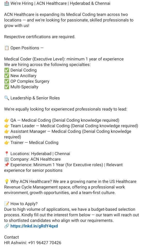 • Medical Coder, QA, Team Leader, Assistant Manager & Trainer Roles – Apply Now with Required Certifications