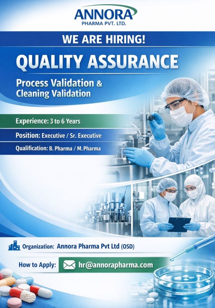 HomeHomeQuality Assurance Job Opening for Process Validation & Cleaning Validation at Annora Pharma Quality Assurance Job Opening for Process Validation & Cleaning Validation at Annora Pharma chandrakanth March 17, 2026 Post Views: 3 Related posts: SSterling Hospitals Hiring 2025 | Medical Officer, Staff Nurse & Assistant Manager Jobs AP కాంట్రాక్ట్ / అవుట్సోర్సింగ్ ఉద్యోగాలు 2025 | RMC Jobs Recruitment 2025 | అర్హత & దరఖాస్తు వివరాలు Sai Life Sciences Walk-In Interview 2026 | Analytical R&D (API) Jobs – Hyderabad Hiring HCC Coder 2026: Freshers & Experienced | Work from Home / Office | Apply Now Share Pinterest Tweet Email Linkedin Whatsapp Telegram Prev Article Next Article Leave a Reply Cancel Reply Save my name, email, and website in this browser for the next time I comment.