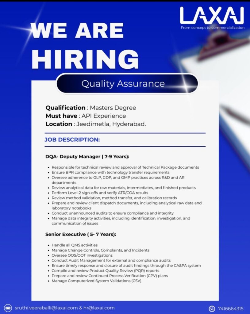 HomeHomeQuality Assurance Jobs in Hyderabad | DQA Deputy Manager & Senior Executive Openings at Laxai | API Experience Required Quality Assurance Jobs in Hyderabad | DQA Deputy Manager & Senior Executive Openings at Laxai | API Experience Required chandrakanth March 14, 2026 Post Views: 9 Related posts: SSterling Hospitals Hiring 2025 | Medical Officer, Staff Nurse & Assistant Manager Jobs AP కాంట్రాక్ట్ / అవుట్సోర్సింగ్ ఉద్యోగాలు 2025 | RMC Jobs Recruitment 2025 | అర్హత & దరఖాస్తు వివరాలు Sai Life Sciences Walk-In Interview 2026 | Analytical R&D (API) Jobs – Hyderabad Intern Clinical Research Coordinator Jobs in PCMC, Pune – Freshers Hiring Share Pinterest Tweet Email Linkedin Whatsapp Telegram Prev Article Next Article Leave a Reply Cancel Reply Save my name, email, and website in this browser for the next time I comment.