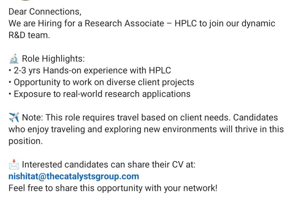 HomeHomeResearch Associate – HPLC Job Opening: Join Our R&D Team + Travel Opportunities | The Catalysts Group Research Associate – HPLC Job Opening: Join Our R&D Team + Travel Opportunities | The Catalysts Group chandrakanth March 29, 2026 Post Views: 5 Related posts: Intern Clinical Research Coordinator Jobs in PCMC, Pune – Freshers Hiring Team Leader – Analytical Method Development (GC/GCMS, E&L) Job in Mumbai Trainee Analyst Job Opening at Raptim Research – M.Sc. Chemistry / M.Pharm Fresher | Mahape, Navi Mumbai 2026 Work From Home Hiring: Data Entry, HR, Recruitment Roles (Freshers Welcome) Share Pinterest Tweet Email Linkedin Whatsapp Telegram Prev Article Next Article Leave a Reply Cancel Reply Save my name, email, and website in this browser for the next time I comment.