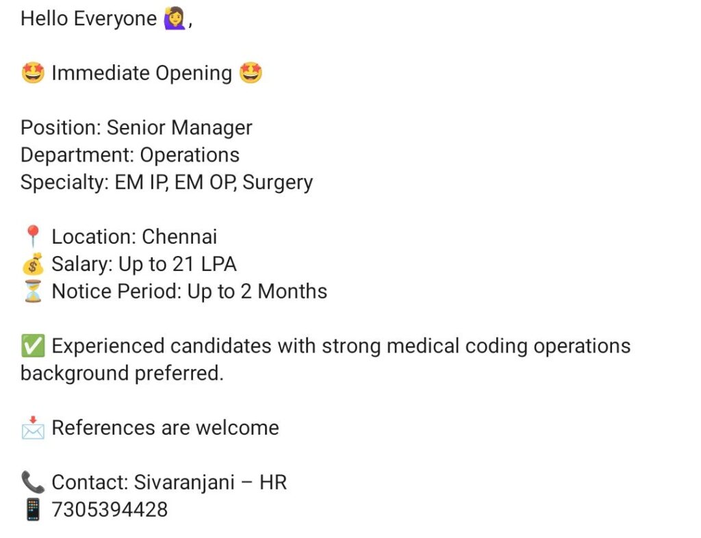 • Senior Manager – Operations (Medical Coding) Job Opening in Chennai | EM IP / EM OP / Surgery | Salary up to 21 LPA