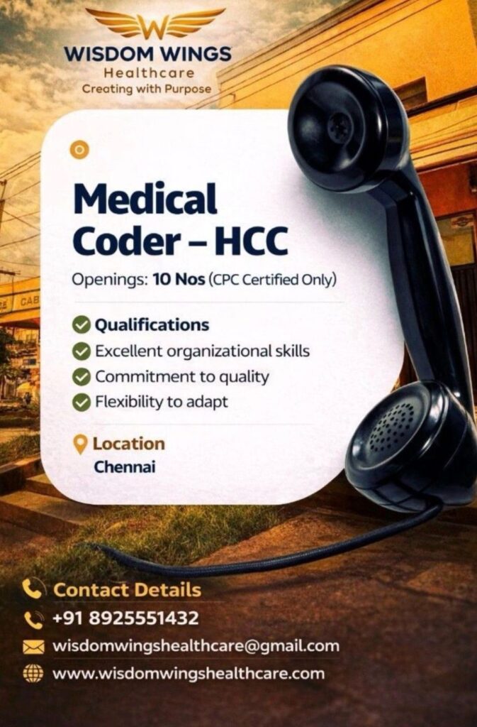 HomeHomeUrgent Hiring: Medical Coder (HCC) – CPC Certified | Chennai Location Urgent Hiring: Medical Coder (HCC) – CPC Certified | Chennai Location chandrakanth March 29, 2026 Post Views: 3 Related posts: SSterling Hospitals Hiring 2025 | Medical Officer, Staff Nurse & Assistant Manager Jobs AP కాంట్రాక్ట్ / అవుట్సోర్సింగ్ ఉద్యోగాలు 2025 | RMC Jobs Recruitment 2025 | అర్హత & దరఖాస్తు వివరాలు Sai Life Sciences Walk-In Interview 2026 | Analytical R&D (API) Jobs – Hyderabad Intern Clinical Research Coordinator Jobs in PCMC, Pune – Freshers Hiring Share Pinterest Tweet Email Linkedin Whatsapp Telegram Prev Article Next Article Leave a Reply Cancel Reply Save my name, email, and website in this browser for the next time I comment.