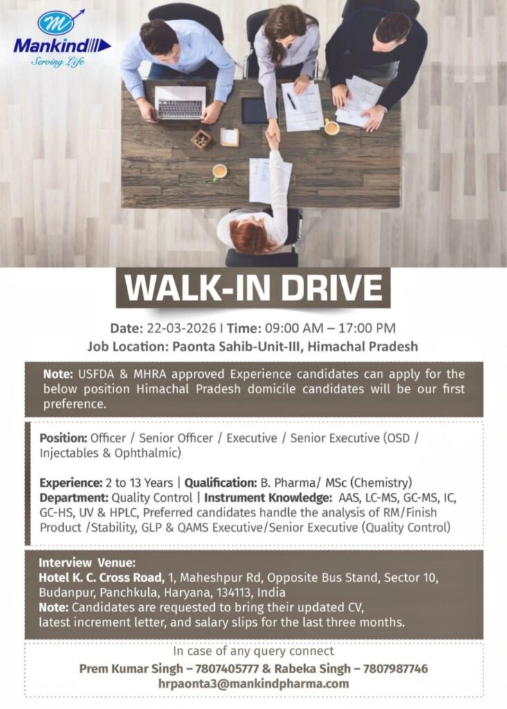HomeHomeUSFDA/MHRA Approved Candidates: Mankind Pharma QC Walk-in | Panchkula | 22 March 2026 USFDA/MHRA Approved Candidates: Mankind Pharma QC Walk-in | Panchkula | 22 March 2026 chandrakanth March 15, 2026 Post Views: 3 Related posts: SSterling Hospitals Hiring 2025 | Medical Officer, Staff Nurse & Assistant Manager Jobs AP కాంట్రాక్ట్ / అవుట్సోర్సింగ్ ఉద్యోగాలు 2025 | RMC Jobs Recruitment 2025 | అర్హత & దరఖాస్తు వివరాలు Sai Life Sciences Walk-In Interview 2026 | Analytical R&D (API) Jobs – Hyderabad Hiring HCC Coder 2026: Freshers & Experienced | Work from Home / Office | Apply Now Share Pinterest Tweet Email Linkedin Whatsapp Telegram Prev Article Next Article Leave a Reply Cancel Reply Save my name, email, and website in this browser for the next time I comment.