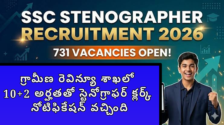 Staff Selection Commission Recruitment 2026 Latest SSC Stenographer Grade ‘C’ & ‘D’ Jobs Notification 2026 Apply Now🏛️ స్టాఫ్ సెలక్షన్ కమిషన్ (SSC) లో స్టెనోగ్రాఫర్ గ్రేడ్ ‘D’ (గ్రూప్ ‘C’) 731 ఖాళీలు పోస్టుల ప్రత్యక్ష నియామకం కోసం 24 ఏప్రిల్ 2026 నోటిఫికేషన్ విడుదల చేశారు.🎓 ఈ ఉద్యోగానికి కేవలం 12th క్లాస్ పాస్ అయిన అభ్యర్థులు అప్లై చేసుకోవచ్చు.💻 ఆన్‌లైన్ దరఖాస్తులను స్వీకరించడానికి చివరి తేదీ: 15-05-2026 (23:00 గంటలు) లోపు, SSC వెబ్‌సైట్ https://ssc.gov.in ద్వారా ఆన్లైన్లో దరఖాస్తు చేసుకోవాలి.