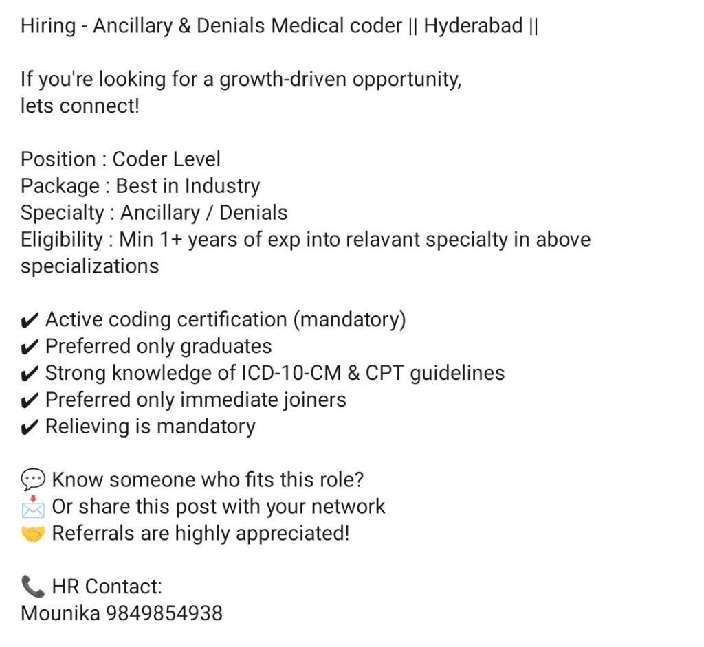 HomeHomeAncillary & Denials Medical Coder – Hyderabad – 1+ Yr Exp – Active Coding Certification (CPC/CCS) – Immediate Joiners Ancillary & Denials Medical Coder – Hyderabad – 1+ Yr Exp – Active Coding Certification (CPC/CCS) – Immediate Joiners chandrakanth April 11, 2026 Post Views: 2 Related posts: Hiring Home Health Coding Experts: Team Lead, QA & Coder | Mumbai, Hyderabad, Chennai | Up to ₹15 LPA Patient Calling RCM Jobs in Chennai – Night Shift | 1–3 Years Experience | Immediate Joining HR Executive Job in Chennai & Madurai | Zaitoon Restaurants | ₹25k–₹30k | Hiring Now Remote Medical Coder – Freshers & Experienced – Trispect Health Medics (WFH, Night Shift, Training Provided) Share Pinterest Tweet Email Linkedin Whatsapp Telegram Prev Article Next Article Leave a Reply Cancel Reply Save my name, email, and website in this browser for the next time I comment.
