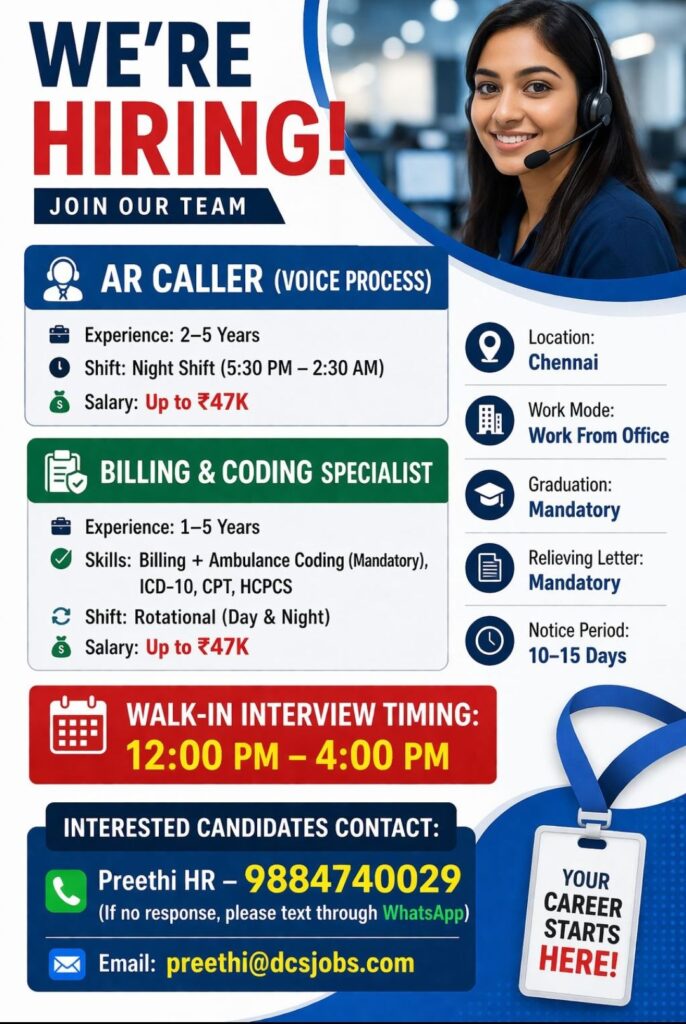 HomeHomeAR Caller & Billing/Coding Specialist – Chennai (WFO, Night Shift) – Up to ₹47K – 1–5 Yrs Exp – Walk-In AR Caller & Billing/Coding Specialist – Chennai (WFO, Night Shift) – Up to ₹47K – 1–5 Yrs Exp – Walk-In chandrakanth April 9, 2026 Post Views: 3 Related posts: SSterling Hospitals Hiring 2025 | Medical Officer, Staff Nurse & Assistant Manager Jobs AP కాంట్రాక్ట్ / అవుట్సోర్సింగ్ ఉద్యోగాలు 2025 | RMC Jobs Recruitment 2025 | అర్హత & దరఖాస్తు వివరాలు Sai Life Sciences Walk-In Interview 2026 | Analytical R&D (API) Jobs – Hyderabad Fresher Walk-in Interviews in Daman: B.Pharm, M.Sc, ITI, Diploma | USV Pharma Jobs – 18 Jan 2026 Share Pinterest Tweet Email Linkedin Whatsapp Telegram Prev Article Next Article Leave a Reply Cancel Reply Save my name, email, and website in this browser for the next time I comment.