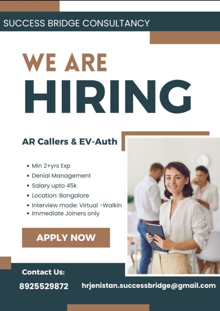 AR Caller & EV-Auth (Denial Management) – Bangalore – 2+ Years Exp – Up to ₹45K – Virtual/Walk-In – Immediate Joiners