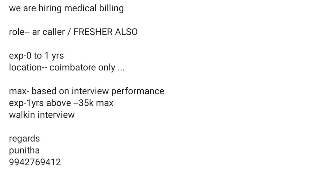 HomeHomeAR Caller (Freshers & Experienced) – Medical Billing – Coimbatore – Walk-In – Up to ₹35K – Punitha HR AR Caller (Freshers & Experienced) – Medical Billing – Coimbatore – Walk-In – Up to ₹35K – Punitha HR chandrakanth April 11, 2026 Post Views: 1 Related posts: Hiring Home Health Coding Experts: Team Lead, QA & Coder | Mumbai, Hyderabad, Chennai | Up to ₹15 LPA Patient Calling RCM Jobs in Chennai – Night Shift | 1–3 Years Experience | Immediate Joining HR Executive Job in Chennai & Madurai | Zaitoon Restaurants | ₹25k–₹30k | Hiring Now Remote Medical Coder – Freshers & Experienced – Trispect Health Medics (WFH, Night Shift, Training Provided) Share Pinterest Tweet Email Linkedin Whatsapp Telegram Prev Article Next Article Leave a Reply Cancel Reply Save my name, email, and website in this browser for the next time I comment.