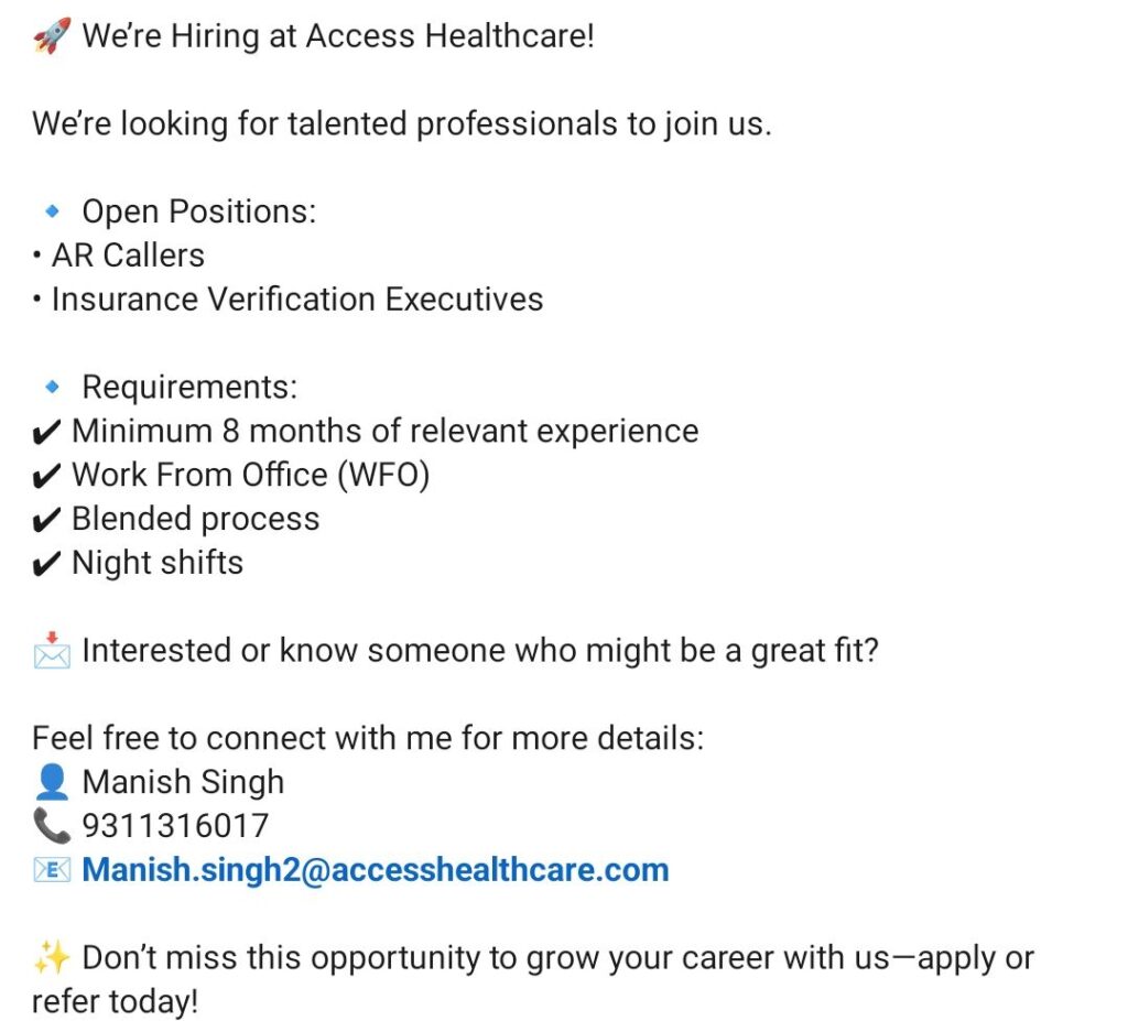 AR Caller & Insurance Verification Executive – Access Healthcare (WFO, Night Shift) – 8+ Months Exp – Apply Now