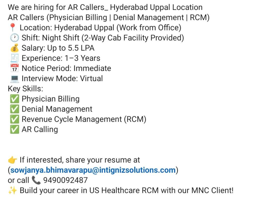 HomeHomeAR Caller (Physician Billing, Denial Management, RCM) – Hyderabad (Uppal, WFO) – 1–3 Years Exp – Up to 5.5 LPA – Night Shift + Cab AR Caller (Physician Billing, Denial Management, RCM) – Hyderabad (Uppal, WFO) – 1–3 Years Exp – Up to 5.5 LPA – Night Shift + Cab chandrakanth April 21, 2026 Post Views: 2 Related posts: SSterling Hospitals Hiring 2025 | Medical Officer, Staff Nurse & Assistant Manager Jobs AP కాంట్రాక్ట్ / అవుట్సోర్సింగ్ ఉద్యోగాలు 2025 | RMC Jobs Recruitment 2025 | అర్హత & దరఖాస్తు వివరాలు Sai Life Sciences Walk-In Interview 2026 | Analytical R&D (API) Jobs – Hyderabad Fresher Walk-in Interviews in Daman: B.Pharm, M.Sc, ITI, Diploma | USV Pharma Jobs – 18 Jan 2026 Share Pinterest Tweet Email Linkedin Whatsapp Telegram Prev Article Next Article Leave a Reply Cancel Reply Save my name, email, and website in this browser for the next time I comment.