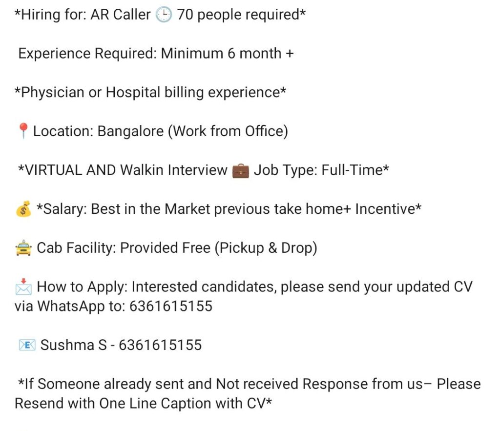 HomeHomeAR Caller (Physician/Hospital Billing) – Bangalore (WFO, Free Cab) – 6+ Months Exp – Virtual & Walk-In Interview AR Caller (Physician/Hospital Billing) – Bangalore (WFO, Free Cab) – 6+ Months Exp – Virtual & Walk-In Interview chandrakanth April 9, 2026 Post Views: 3 Related posts: SSterling Hospitals Hiring 2025 | Medical Officer, Staff Nurse & Assistant Manager Jobs AP కాంట్రాక్ట్ / అవుట్సోర్సింగ్ ఉద్యోగాలు 2025 | RMC Jobs Recruitment 2025 | అర్హత & దరఖాస్తు వివరాలు Sai Life Sciences Walk-In Interview 2026 | Analytical R&D (API) Jobs – Hyderabad Fresher Walk-in Interviews in Daman: B.Pharm, M.Sc, ITI, Diploma | USV Pharma Jobs – 18 Jan 2026 Share Pinterest Tweet Email Linkedin Whatsapp Telegram Prev Article Next Article Leave a Reply Cancel Reply Save my name, email, and website in this browser for the next time I comment.