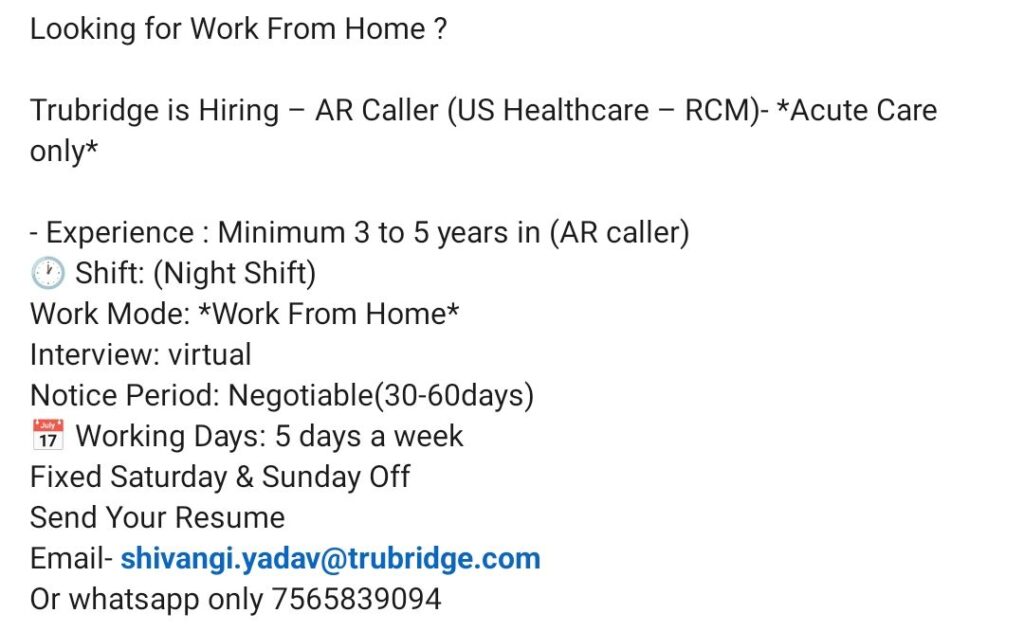 HomeHomeAR Caller (US Healthcare RCM – Acute Care) – Trubridge – Work From Home (Night Shift) – 3–5 Years Exp – Sat/Sun Off AR Caller (US Healthcare RCM – Acute Care) – Trubridge – Work From Home (Night Shift) – 3–5 Years Exp – Sat/Sun Off chandrakanth April 17, 2026 Post Views: 2 Related posts: Trainee HCC Coder – Bangalore (Virtual Interview) – 3–11 Months Exp – CRC/CPC/CCS Mandatory – Immediate Joiner R&D Scientist, QA Officer, Analyst, Lift Operator – Multani Pharmaceuticals (Haridwar) – 3–7 Yrs Exp – B.Pharm / M.Sc / Diploma Trainee Medical Coder (CPC Certified Fresher) – Omega Healthcare (Chennai) – ₹24K CTC / ₹19K In-Hand – Virtual Interview Scientist / Research Scientist – Bioanalytical (Generics, LC-MS/MS) – Bachwell Pharma (Hyderabad) – 5–8 Years Exp – M.Pharm / M.Sc Share Pinterest Tweet Email Linkedin Whatsapp Telegram Prev Article Next Article Leave a Reply Cancel Reply Save my name, email, and website in this browser for the next time I comment.