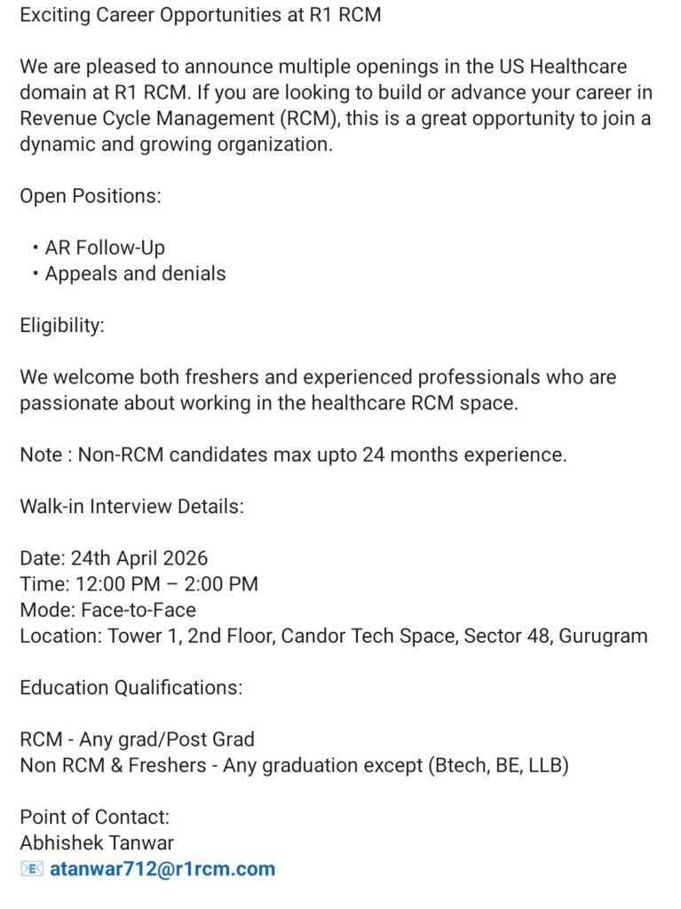 HomeHomeAR Follow-Up & Appeals/Denials – R1 RCM (Gurugram) – Freshers & Experienced – Walk-In April 24, 2026 – US Healthcare RCM AR Follow-Up & Appeals/Denials – R1 RCM (Gurugram) – Freshers & Experienced – Walk-In April 24, 2026 – US Healthcare RCM chandrakanth April 21, 2026 Post Views: 2 Related posts: SSterling Hospitals Hiring 2025 | Medical Officer, Staff Nurse & Assistant Manager Jobs AP కాంట్రాక్ట్ / అవుట్సోర్సింగ్ ఉద్యోగాలు 2025 | RMC Jobs Recruitment 2025 | అర్హత & దరఖాస్తు వివరాలు Sai Life Sciences Walk-In Interview 2026 | Analytical R&D (API) Jobs – Hyderabad Fresher Walk-in Interviews in Daman: B.Pharm, M.Sc, ITI, Diploma | USV Pharma Jobs – 18 Jan 2026 Share Pinterest Tweet Email Linkedin Whatsapp Telegram Prev Article Next Article Leave a Reply Cancel Reply Save my name, email, and website in this browser for the next time I comment.