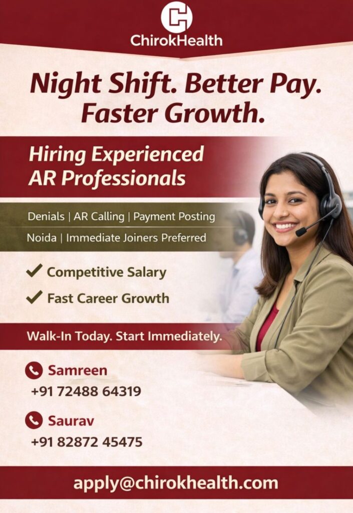 HomeHomeAR Professional (Denials, AR Calling, Payment Posting) – Chirok Health (Noida) – Night Shift – Immediate Joiners – Walk-In AR Professional (Denials, AR Calling, Payment Posting) – Chirok Health (Noida) – Night Shift – Immediate Joiners – Walk-In chandrakanth April 20, 2026 Post Views: 1 Related posts: SSterling Hospitals Hiring 2025 | Medical Officer, Staff Nurse & Assistant Manager Jobs AP కాంట్రాక్ట్ / అవుట్సోర్సింగ్ ఉద్యోగాలు 2025 | RMC Jobs Recruitment 2025 | అర్హత & దరఖాస్తు వివరాలు Sai Life Sciences Walk-In Interview 2026 | Analytical R&D (API) Jobs – Hyderabad Fresher Walk-in Interviews in Daman: B.Pharm, M.Sc, ITI, Diploma | USV Pharma Jobs – 18 Jan 2026 Share Pinterest Tweet Email Linkedin Whatsapp Telegram Prev Article Leave a Reply Cancel Reply Save my name, email, and website in this browser for the next time I comment.