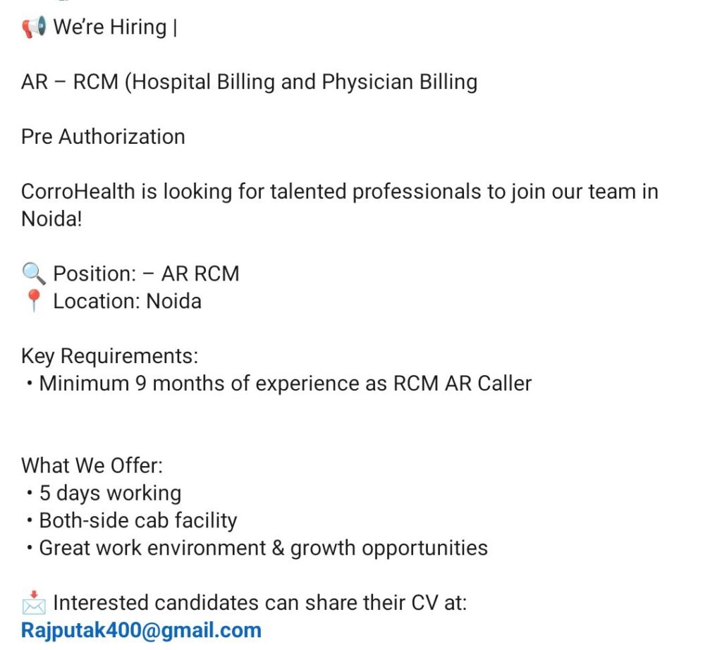HomeHomeAR – RCM (Hospital & Physician Billing, Pre-Authorization) – CorroHealth Noida – 9+ Months Exp – 5 Days Work + Cab AR – RCM (Hospital & Physician Billing, Pre-Authorization) – CorroHealth Noida – 9+ Months Exp – 5 Days Work + Cab chandrakanth April 11, 2026 Post Views: 1 Related posts: Hiring Home Health Coding Experts: Team Lead, QA & Coder | Mumbai, Hyderabad, Chennai | Up to ₹15 LPA Patient Calling RCM Jobs in Chennai – Night Shift | 1–3 Years Experience | Immediate Joining HR Executive Job in Chennai & Madurai | Zaitoon Restaurants | ₹25k–₹30k | Hiring Now Remote Medical Coder – Freshers & Experienced – Trispect Health Medics (WFH, Night Shift, Training Provided) Share Pinterest Tweet Email Linkedin Whatsapp Telegram Prev Article Next Article Leave a Reply Cancel Reply Save my name, email, and website in this browser for the next time I comment.