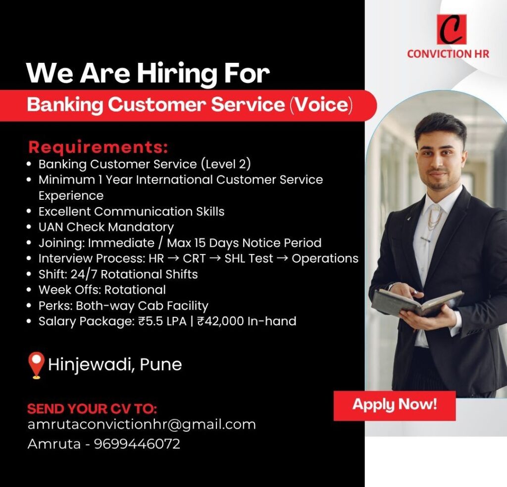 HomeHomeBanking Customer Service (Voice) – Pune (Hinjewadi) – 1+ Yr International Experience – ₹5.5 LPA + Cab – Immediate Joiners Banking Customer Service (Voice) – Pune (Hinjewadi) – 1+ Yr International Experience – ₹5.5 LPA + Cab – Immediate Joiners chandrakanth April 9, 2026 Post Views: 3 Related posts: SSterling Hospitals Hiring 2025 | Medical Officer, Staff Nurse & Assistant Manager Jobs AP కాంట్రాక్ట్ / అవుట్సోర్సింగ్ ఉద్యోగాలు 2025 | RMC Jobs Recruitment 2025 | అర్హత & దరఖాస్తు వివరాలు Sai Life Sciences Walk-In Interview 2026 | Analytical R&D (API) Jobs – Hyderabad Fresher Walk-in Interviews in Daman: B.Pharm, M.Sc, ITI, Diploma | USV Pharma Jobs – 18 Jan 2026 Share Pinterest Tweet Email Linkedin Whatsapp Telegram Prev Article Next Article Leave a Reply Cancel Reply Save my name, email, and website in this browser for the next time I comment.