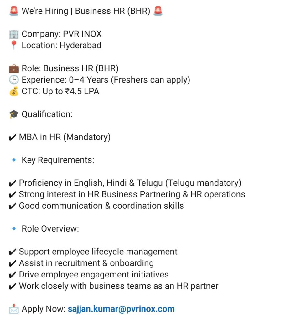 • Business HR Job – Freshers Welcome (0–4 Years) | PVR INOX Hyderabad | CTC up to ₹4.5 LPA