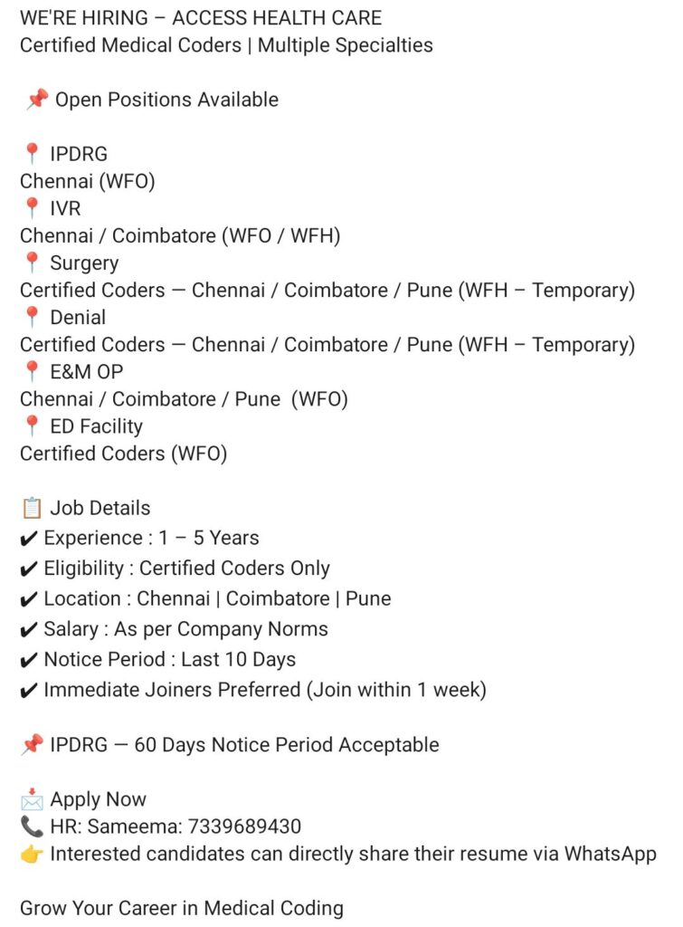 • Certified Medical Coder (IPDRG, IVR, Surgery, Denial, E&M OP, ED Facility) – Access Healthcare (Chennai, Coimbatore, Pune)