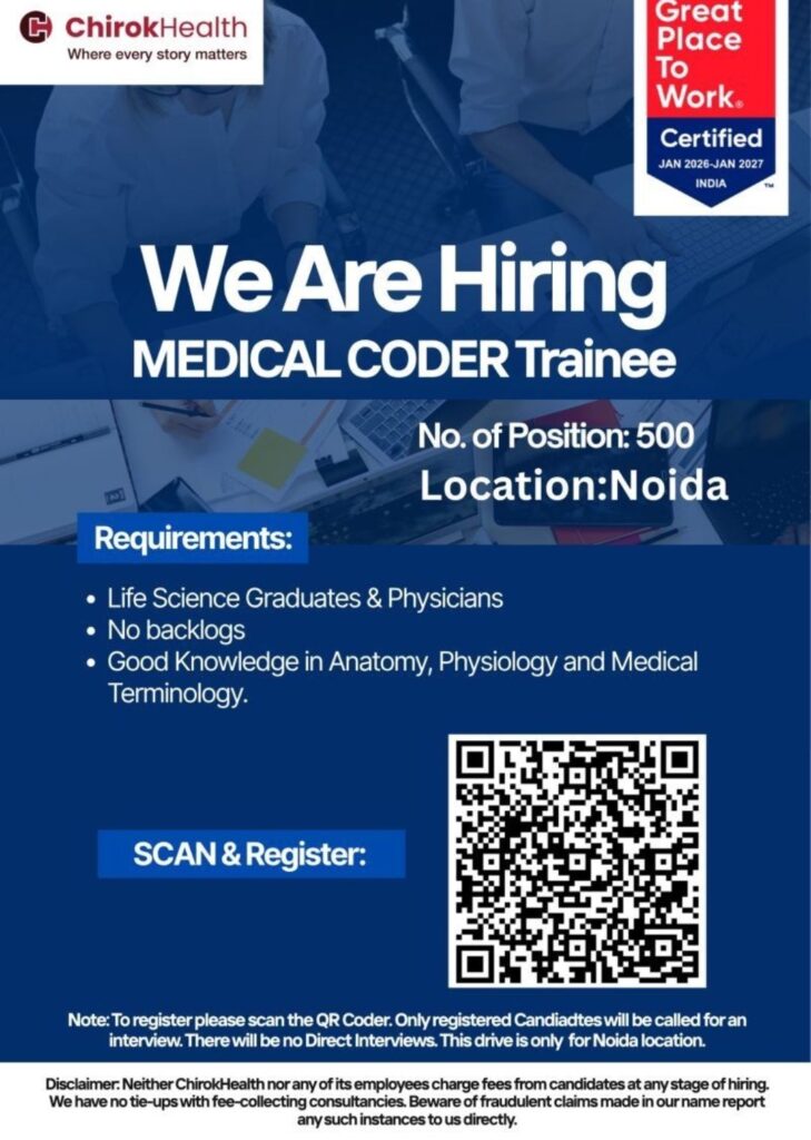 HomeHomeChirok Health Medical Coder Trainee Hiring 2026 | 500 Openings in Noida Chirok Health Medical Coder Trainee Hiring 2026 | 500 Openings in Noida chandrakanth April 4, 2026 Post Views: 2 Related posts: SSterling Hospitals Hiring 2025 | Medical Officer, Staff Nurse & Assistant Manager Jobs AP కాంట్రాక్ట్ / అవుట్సోర్సింగ్ ఉద్యోగాలు 2025 | RMC Jobs Recruitment 2025 | అర్హత & దరఖాస్తు వివరాలు Sai Life Sciences Walk-In Interview 2026 | Analytical R&D (API) Jobs – Hyderabad Fresher Walk-in Interviews in Daman: B.Pharm, M.Sc, ITI, Diploma | USV Pharma Jobs – 18 Jan 2026 Share Pinterest Tweet Email Linkedin Whatsapp Telegram Prev Article Next Article Leave a Reply Cancel Reply Save my name, email, and website in this browser for the next time I comment.