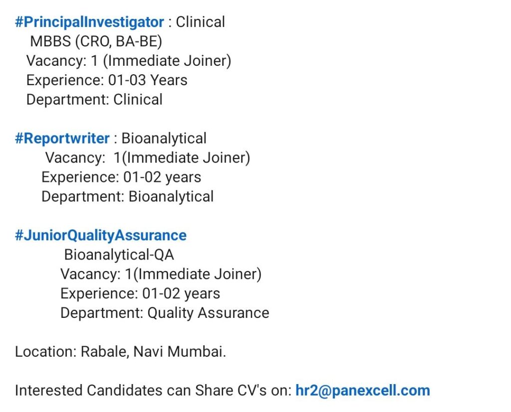 HomeHomeClinical Principal Investigator (MBBS), Report Writer, Jr. QA – Bioanalytical – Panexcell (Navi Mumbai) – 1–3 Yrs Exp Clinical Principal Investigator (MBBS), Report Writer, Jr. QA – Bioanalytical – Panexcell (Navi Mumbai) – 1–3 Yrs Exp chandrakanth April 11, 2026 Post Views: 2 Related posts: Hiring Home Health Coding Experts: Team Lead, QA & Coder | Mumbai, Hyderabad, Chennai | Up to ₹15 LPA Patient Calling RCM Jobs in Chennai – Night Shift | 1–3 Years Experience | Immediate Joining HR Executive Job in Chennai & Madurai | Zaitoon Restaurants | ₹25k–₹30k | Hiring Now Remote Medical Coder – Freshers & Experienced – Trispect Health Medics (WFH, Night Shift, Training Provided) Share Pinterest Tweet Email Linkedin Whatsapp Telegram Prev Article Next Article Leave a Reply Cancel Reply Save my name, email, and website in this browser for the next time I comment.