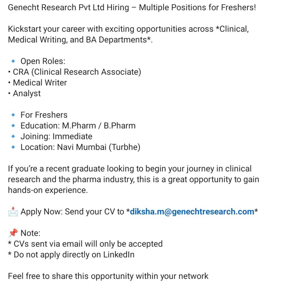 CRA, Medical Writer, Analyst (Freshers) – Genecth Research (Navi Mumbai – Turbhe) – M.Pharm / B.Pharm – Immediate Joiner